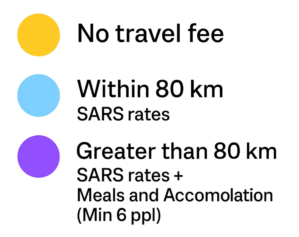 We are completely mobile and can conduct training at your location. We apply SARS-related travel fees, with the roundtrip calculated from Bromhof, Randburg, Gauteng.